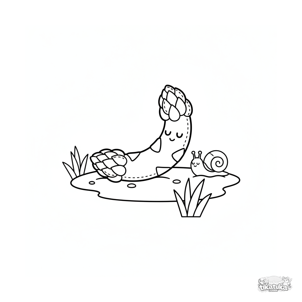 Einfaches Ausmalbild für Kleinkinder: ein Plüsch-Spargel schläft im Gartenbeet. Große Formen, wenige Details. Für 2-3 Jahre.