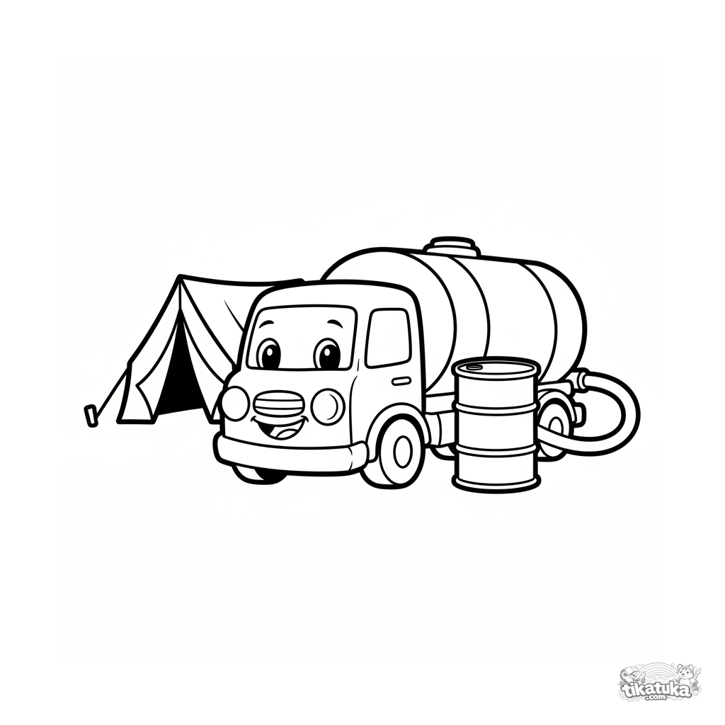 Sehr einfaches Ausmalbild für Kleinkinder 2-3: Ein freundlicher Tankwagen wie ein Plüschtier steht am Versorgungszelt. Lächelnder Kühlergrill, riesige weiße Ränder.