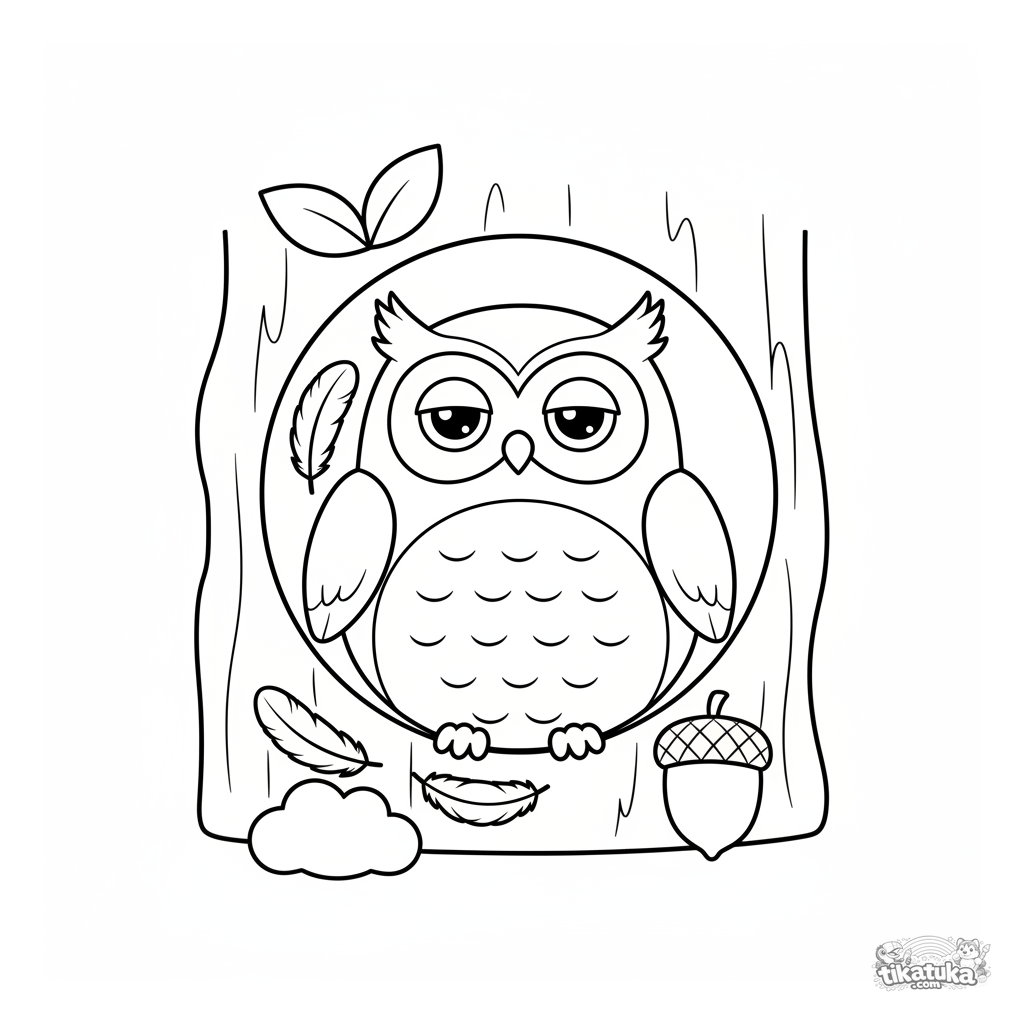Einfaches Ausmalbild für Kleinkinder: Eine Stoffeule kuschelt in einer Baumhöhle. Große, leicht auszumalende Formen mit weiten Rändern für 2-4 Jahre.