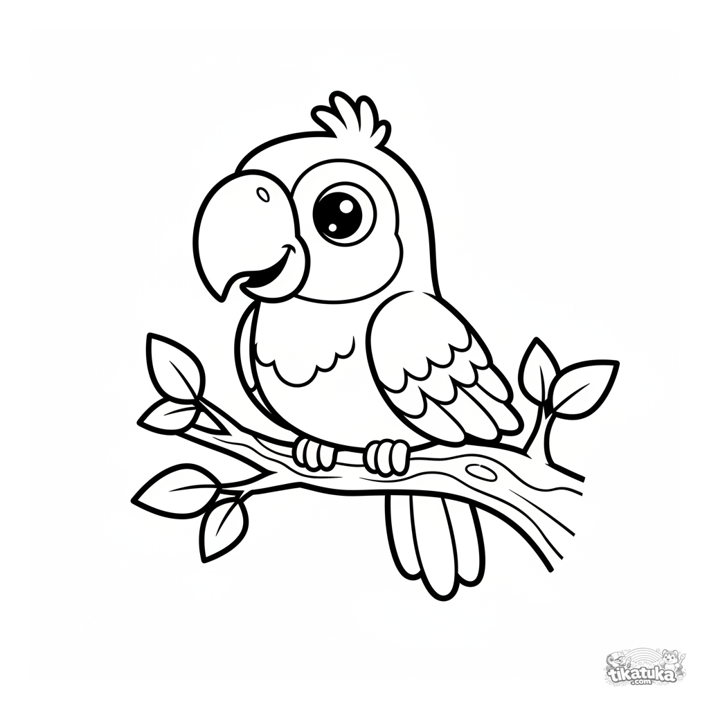 Einfaches Ausmalbild für Kleinkinder: Ein Stoffpapagei schläft auf einem Waldast. Große Formen und weite Ränder, perfekt für Kinder von 2-4 Jahren.