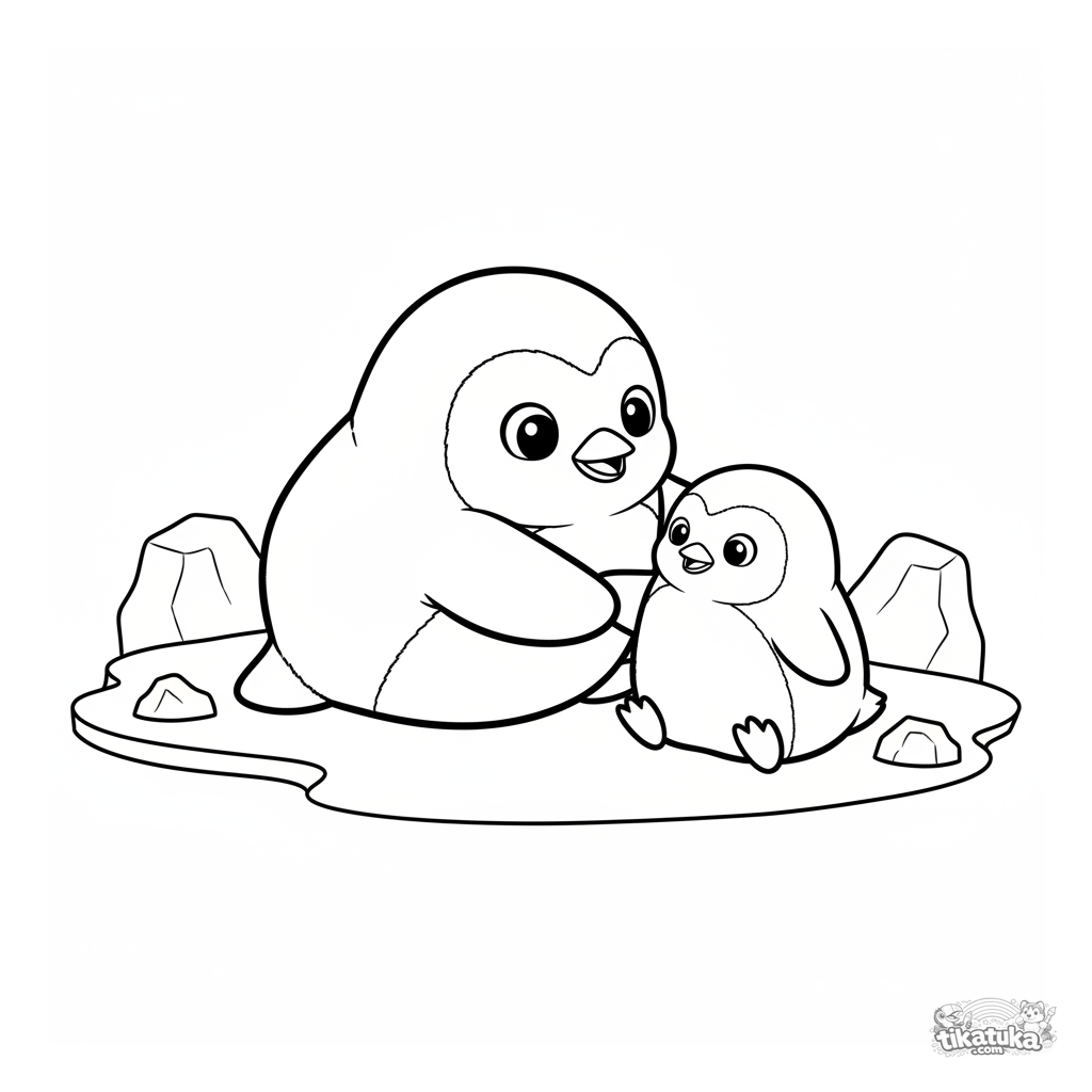 Ausmalbild für Kinder: ein niedlicher Plüsch-Pinguin hilft seinem Freund auf dem Eis aufzustehen. Eine warmherzige Szene über Freundschaft und Hilfsbereitschaft.