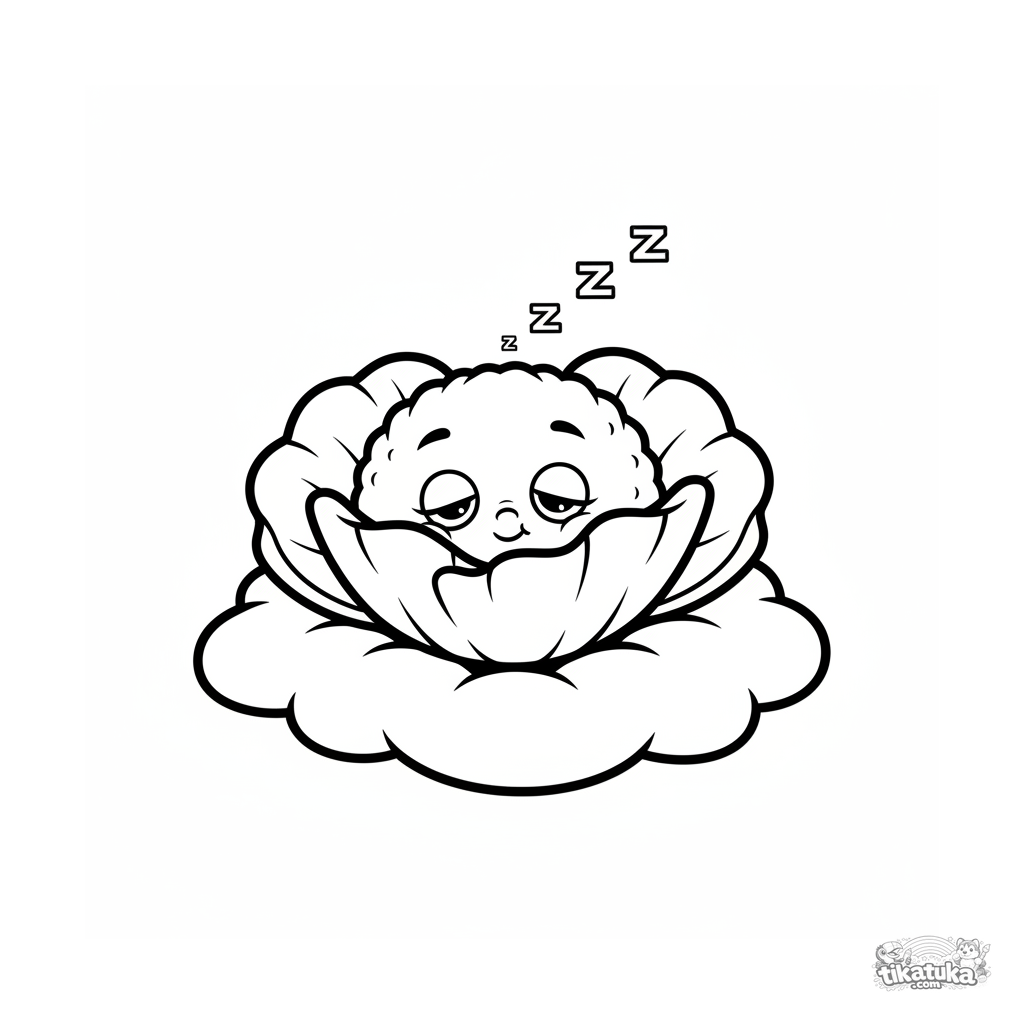 Ausmalbild für Kleinkinder 2-3: Eine Plüsch-Mohnblume schläft fest auf einer flauschigen Wolke. Einfache, große Formen, wenige Details.