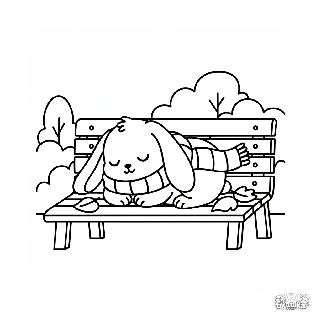 Einfaches Ausmalbild für Kleinkinder 2-3: Ein niedlicher Schal-tragender Hase schläft auf einer Parkbank. Große Formen und weite Ränder.