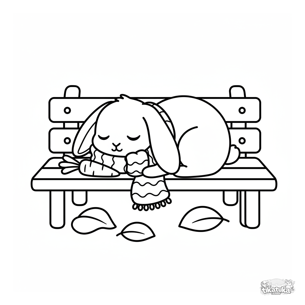 Einfaches Ausmalbild für Kleinkinder 2-3: Ein süßes Plüschkaninchen macht ein Nickerchen auf einer Parkbank.