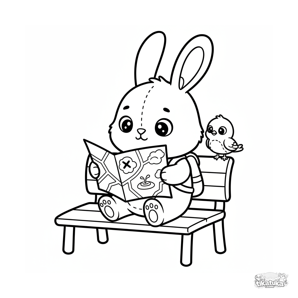 Einfaches Ausmalbild für Kleinkinder 2-3: Ein Plüschhase sitzt auf einer Parkbank und studiert eine große Karte. Große Formen, breite Ränder.