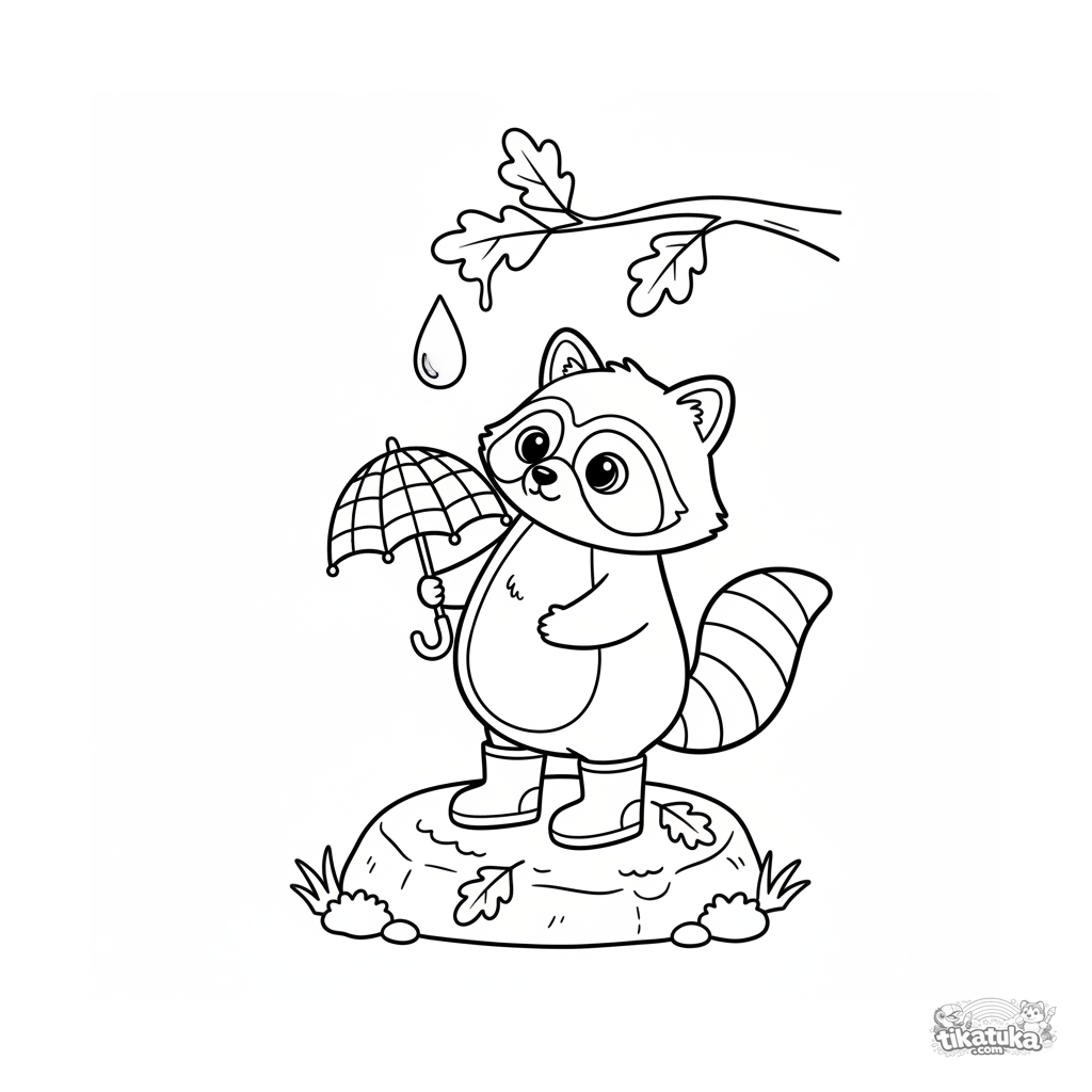 Ausmalbild für Kleinkinder 2-3: Ein Plüsch-Waschbär in Stiefeln hält einen winzigen Regenschirm unter einem tropfenden Ast in einem Herbstwald.