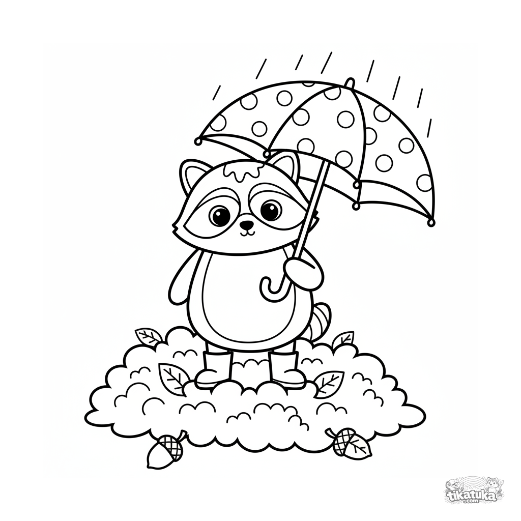 Einfaches Ausmalbild für Kleinkinder 2-3: Ein Plüschwaschbär in Stiefeln mit Regenschirm steht in einem Haufen Herbstblätter im Regen.