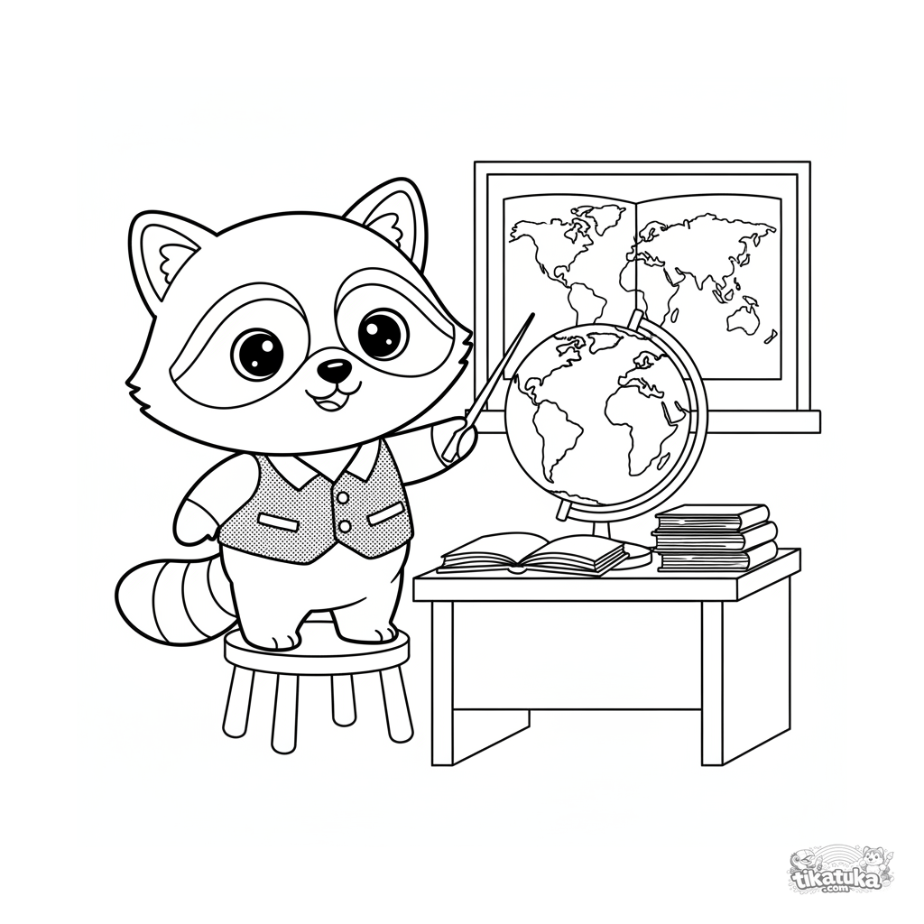 Ausmalbild eines Waschbär-Lehrers an der Tafel mit Globus für Kinder 4-6. Niedliche Figur mit Weste erklärt Geografie, mit Karte und Büchern.