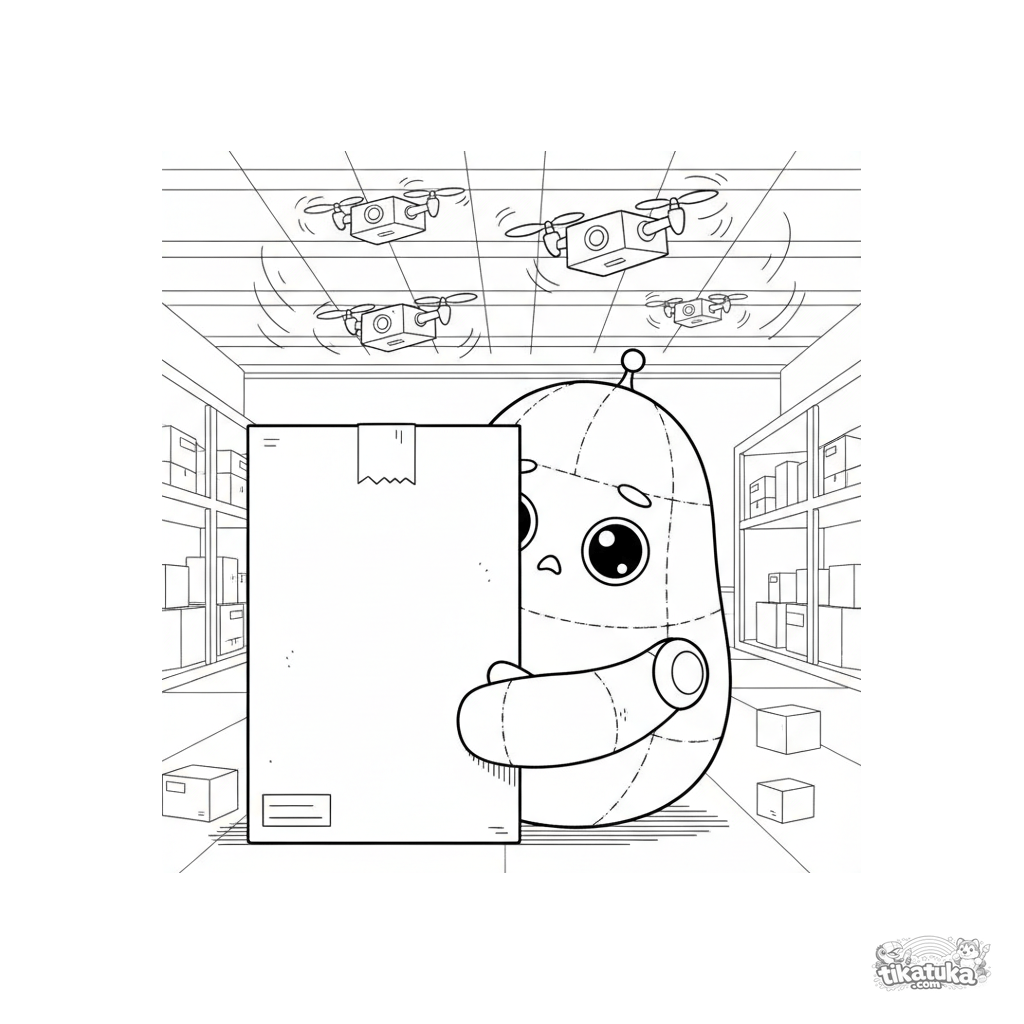 Ausmalbild für Kinder 4-6: Ein süßer Plüschroboter mit genähten Nähten und Knopfaugen lugt schüchtern hinter einem riesigen Karton in einem Lagerhaus hervor und beobachtet, wie Lieferdrohnen vorbeisausen.
