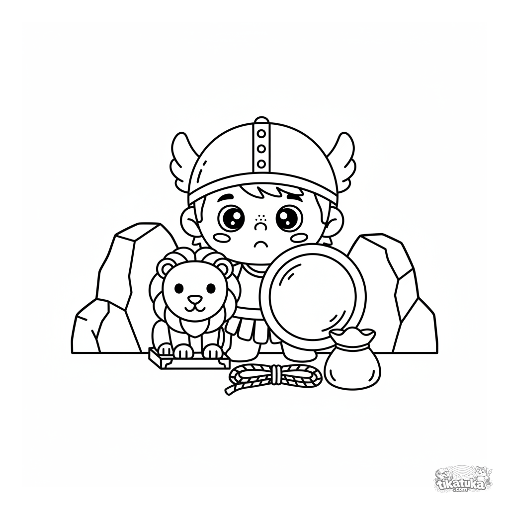 Einfaches Ausmalbild für Kleinkinder 2-3: Stoff-Perseus versteckt sich hinter einer Statue in der Gorgonenhöhle. Große Formen, dicke Umrisse, perfekt für erste Buntstifte.