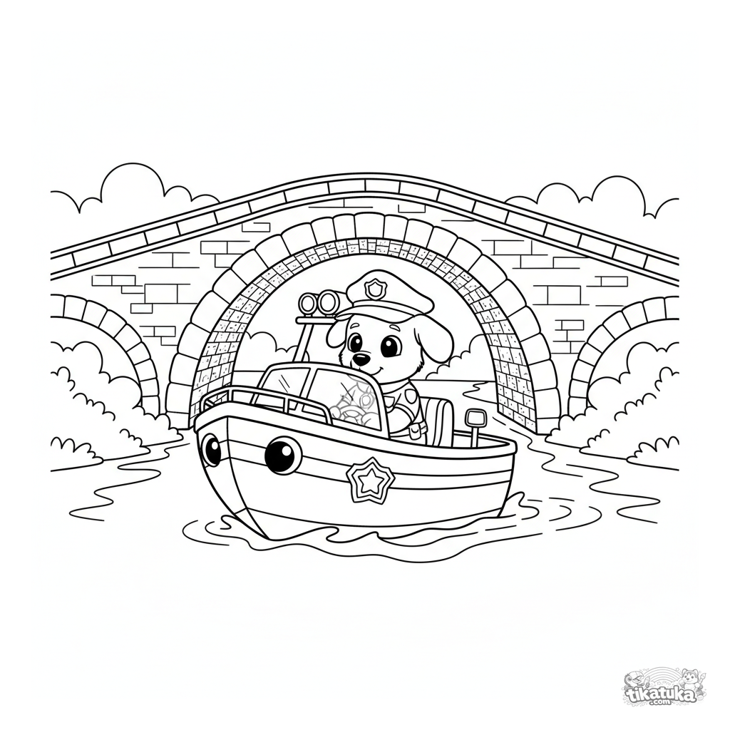 Ausmalbild für Kinder 7-9: Ein Polizeiboot im Einsatz auf dem Fluss, das unter den Bögen einer alten Brücke hindurchfährt. Aktive, aber übersichtliche Szene.