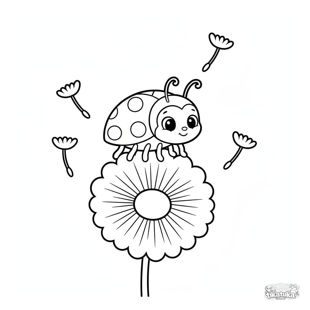 Ausmalbild für Kleinkinder: Ein fröhlicher, gepunkteter Marienkäfer balanciert auf einer Pusteblume. Sehr einfache, große Formen.