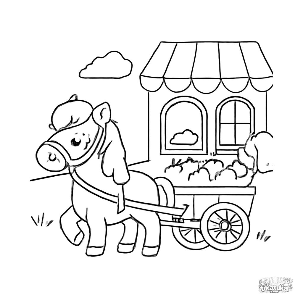 Ausmalbild für Kinder. Braunes Pony mit Holzwagen voller roter Äpfel vor rustikaler Bäckerei mit gestreifter Markise. Kostenlos herunterladen.