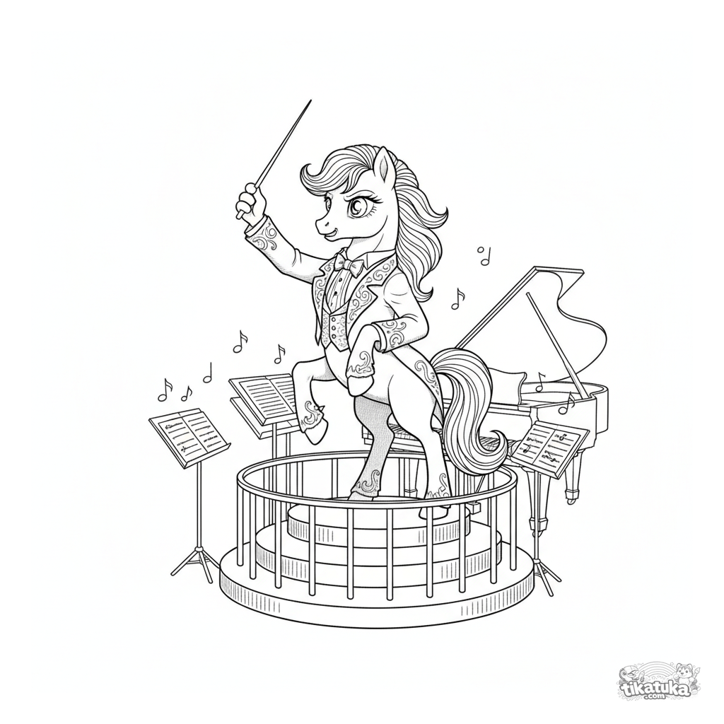 Detailliertes Ausmalbild im Stil eines alten Stichs eines Pony-Dirigenten im Orchestergraben eines Theaters. Für Kinder von 10-12 Jahren. Szene mit Podium und Noten.