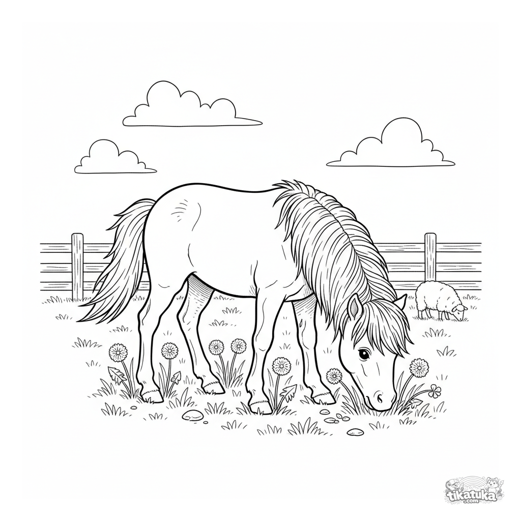 Kinder Ausmalbild: Ein flauschiges Fohlen weidet auf einer grünen Bauernhofweide und frisst Löwenzahn. Leichter Gravierstil, friedliche Szene.