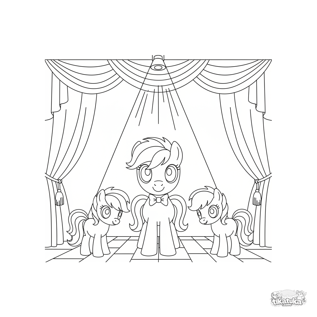 Ausmalbild für Kinder 4-6: Drei Ponys verneigen sich gemeinsam auf der Bühne am Ende einer Show. Klare Figuren, Theatervorhang.