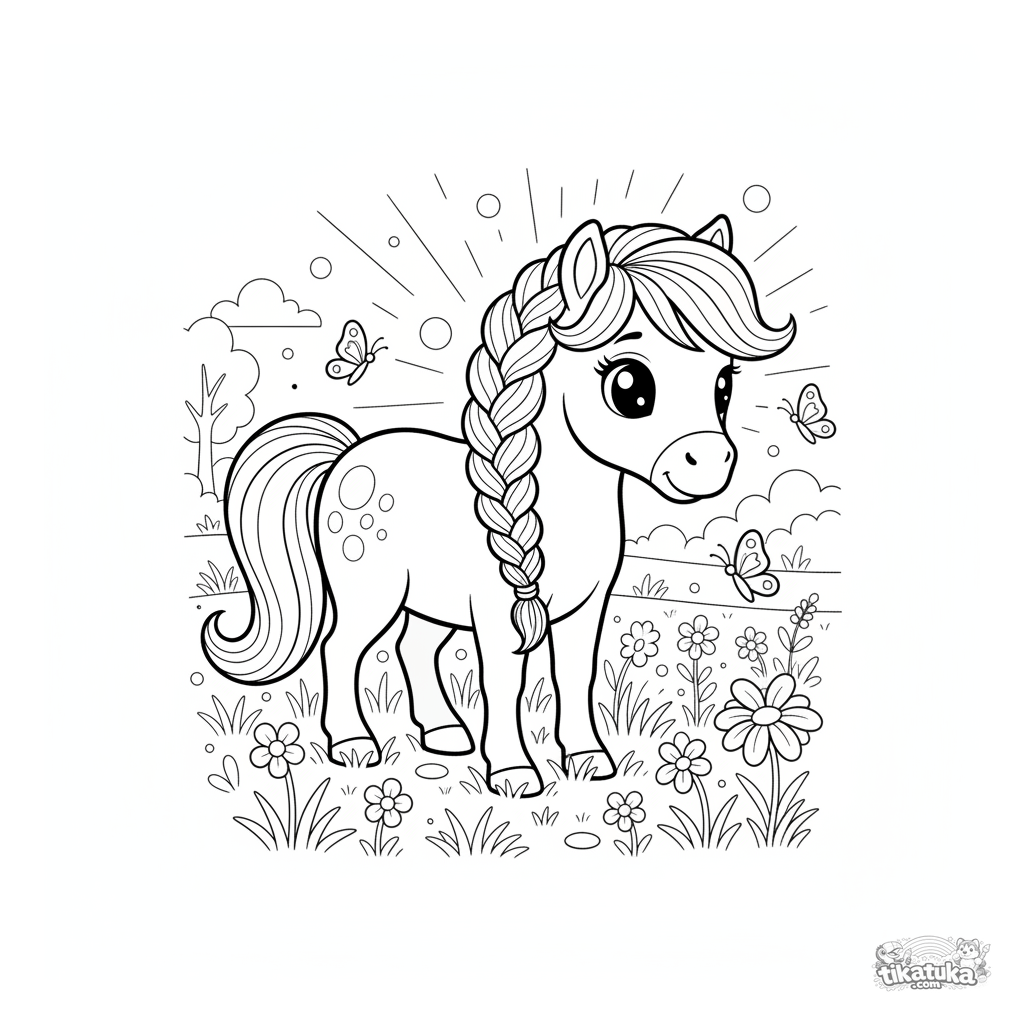 Ausmalbild für Mädchen 4-6: Ein süßes Pony mit geflochtener Mähne weidet auf einer Wiese voller Wildblumen und Schmetterlinge. Friedliche Szene.