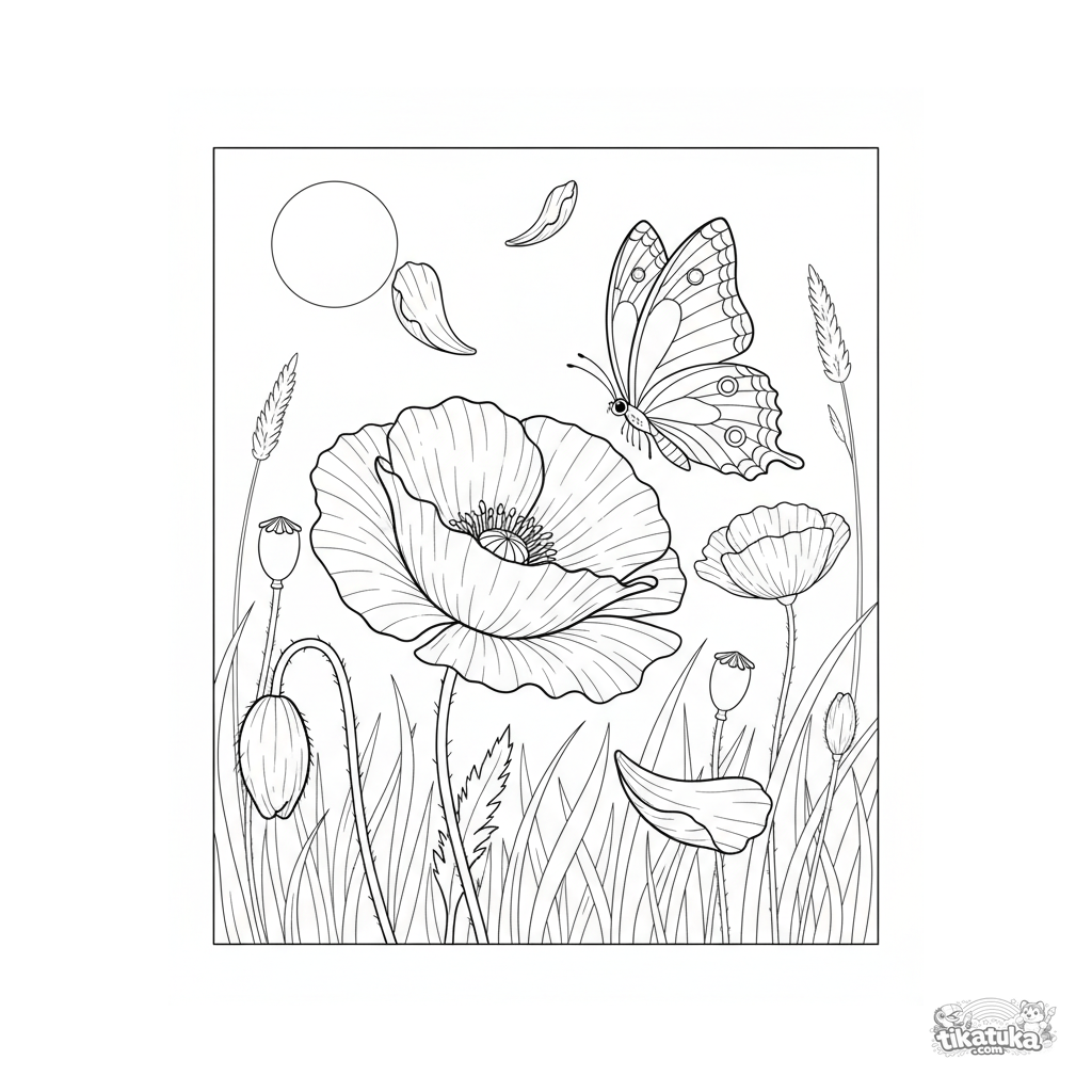 Ausmalbild für Kinder 7-9. Mohnblumen auf einem Feld, fallende Blütenblätter, ein Schmetterling in der Nähe. Naturalistischer Stil, mäßiges Detail.