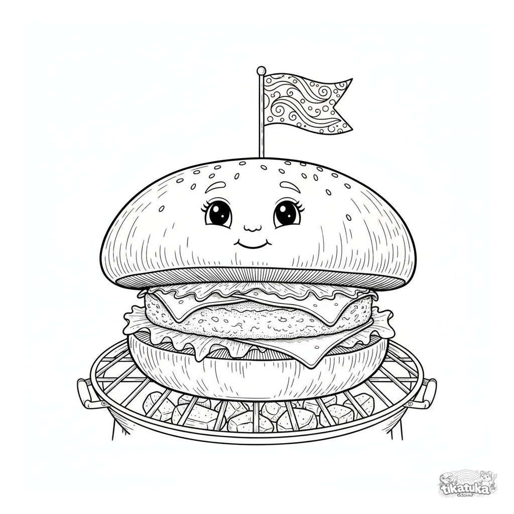 Komplexes Ausmalbild für 10-12 Jahre: Portobello-Pilz-Burger auf Gartengrill. Detaillierte Gravierstil-Linien, Burger-Schichten, weite Ränder.