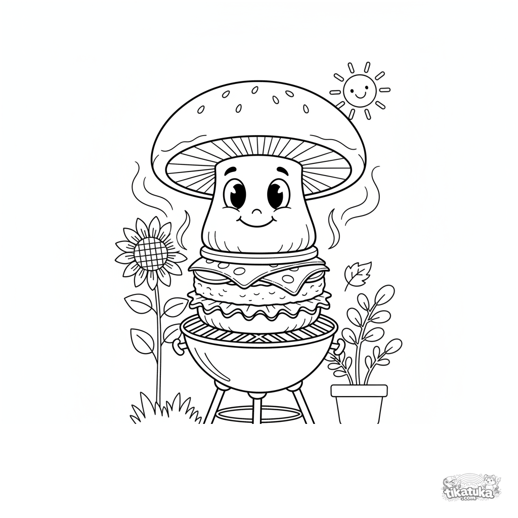 Ausmalbild für Kinder 4-6: Ein hoher vegetarischer Burger mit einem Portobello-Pilz grillt im Garten. Klare Formen, fröhlicher Ausdruck.