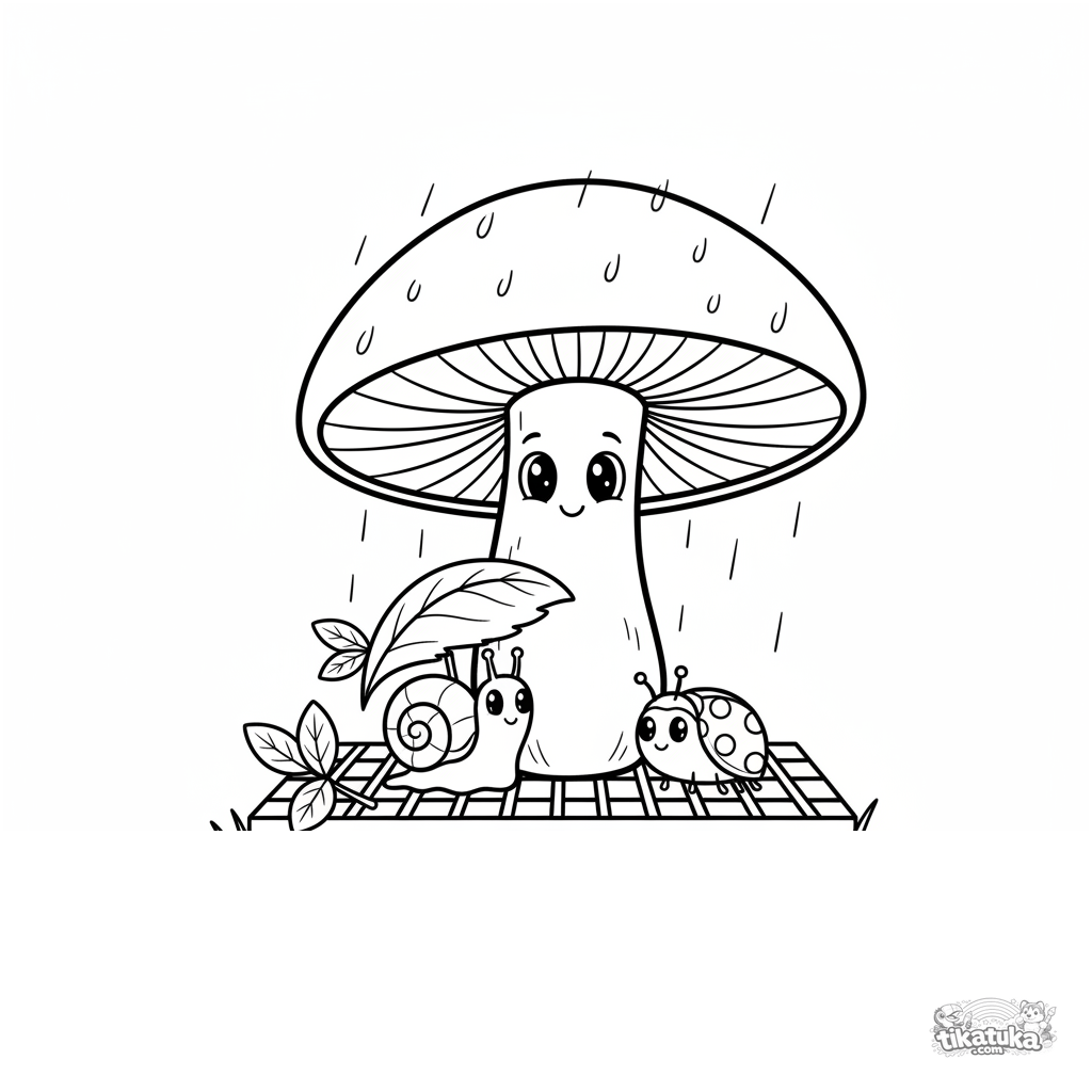 Ausmalbild eines großen Portobello-Pilzes auf einem Garten-Grill, der als Regenschirm für eine Schnecke und einen Marienkäfer dient. Für 4-6 Jahre.