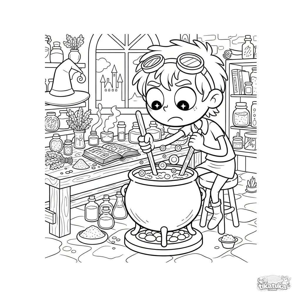 Ausmalbild für Kinder 4-6: ein junger Tranklehrling mit großer Brille rührt vorsichtig einen brodelnden Kessel in einer unordentlichen Zaubererwerkstatt.