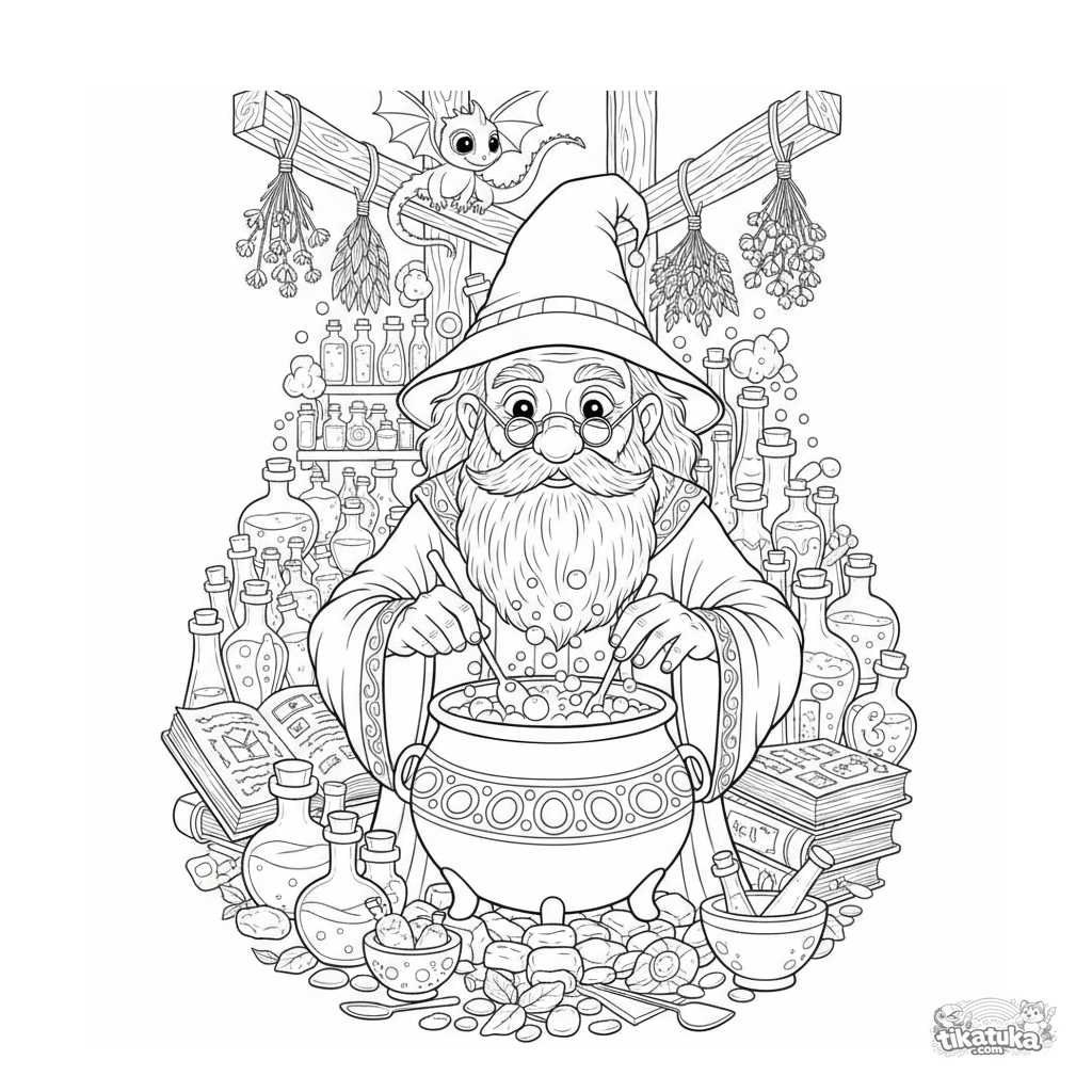 Detailliertes Ausmalbild im Folk-Stil für ältere Kinder 10-12: Ein Zaubertrankmeister bei der Arbeit auf einem gemütlichen Dachboden voller seltsamer Gegenstände.