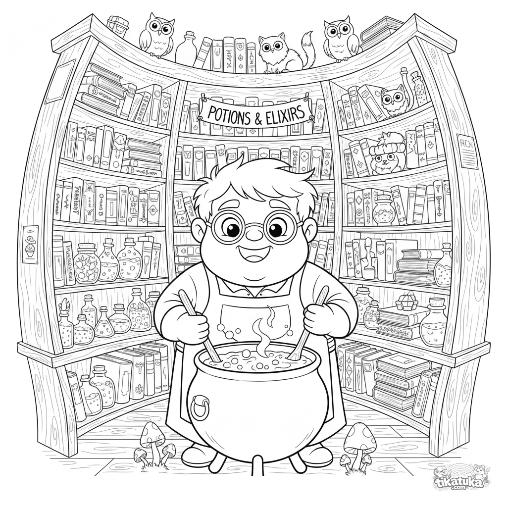Ausmalbild für Kinder 4-6: Ein Trankladen-Besitzer braut ein Gebräu in seiner magischen Bibliothek. Lustige und detaillierte Szene.