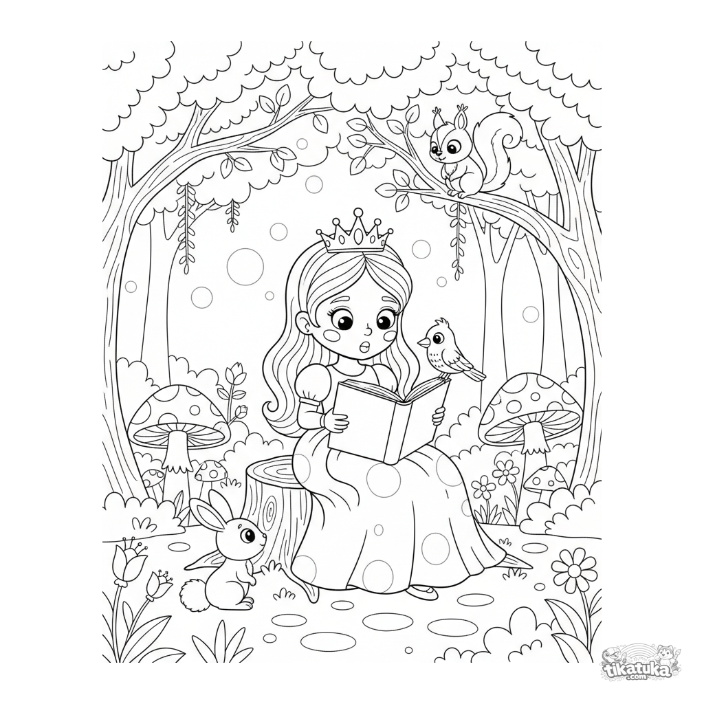 Ausmalbild für Mädchen von 4-6 Jahren: Eine Prinzessin im verzauberten Wald liest Waldtieren ein Buch vor.