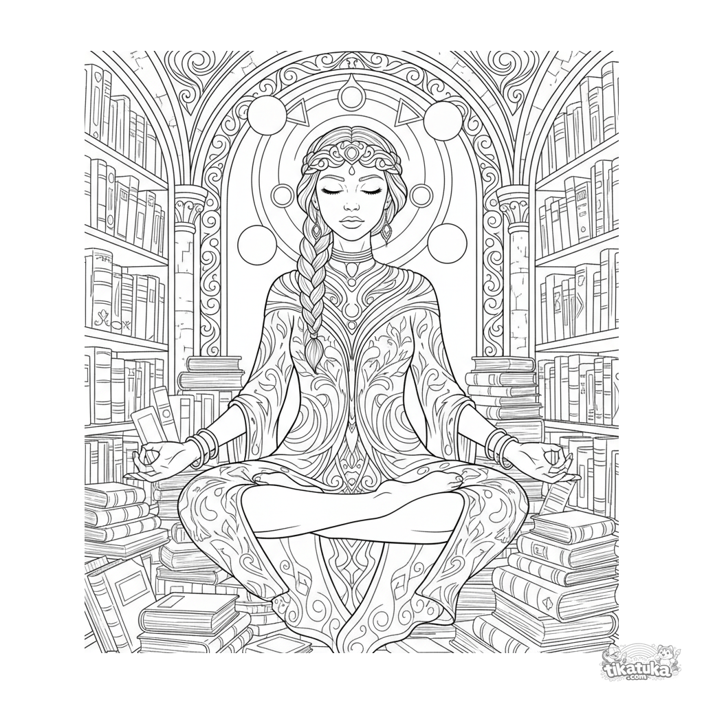 Ausmalbild für Ältere 10-12: Ein Psycho-Superheld meditiert schwebend zwischen hohen Regalen uralter Bücher in einer steinernen Bibliothek.