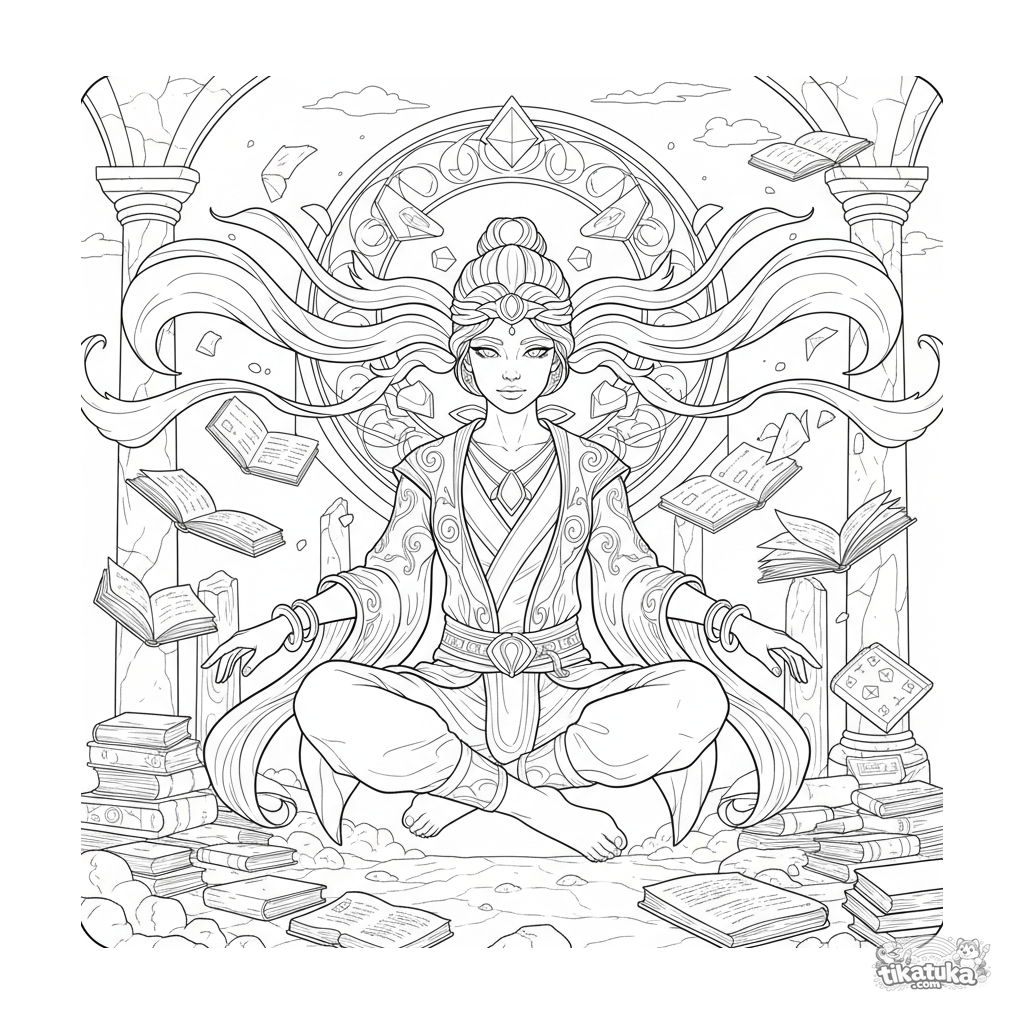 Detailliertes Ausmalbild für 10-12 Jahre: Ein Superheld mit psychischen Kräften meditiert in antiken Bibliotheksruinen, umgeben von schwebenden Büchern.