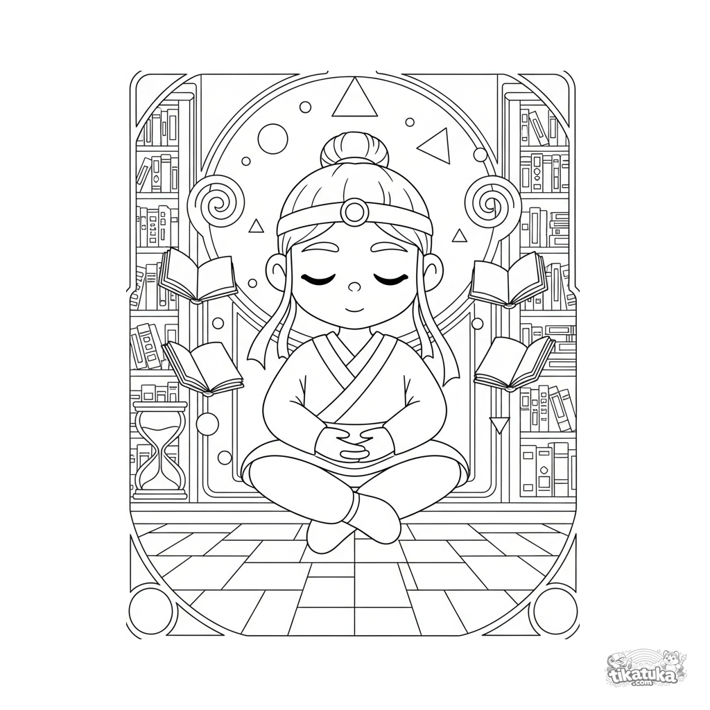 Ausmalbild für Kinder 4-6: Ein psychischer Superheld schwebt meditativ in einer alten Steinbibliothek, umkreist von Büchern. Eine ruhige, mysteriöse Szene.