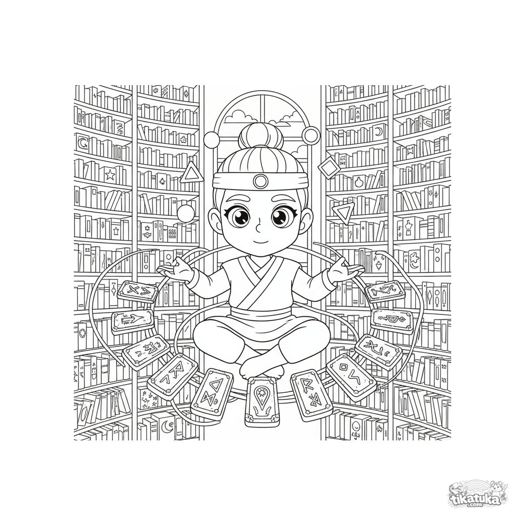 Ausmalbild für 10-12 Jahre: Ein Superheld mit psychischen Kräften löst ein Rätsel aus schwebenden Steintafeln in einer alten, riesigen Bibliothek.