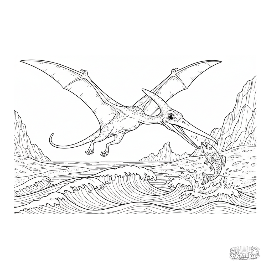 Detailliertes Ausmalbild für Kinder 10-12: ein Flugsaurier im dynamischen Flug fängt einen Fisch über den Wellen eines urzeitlichen Ozeans. Naturalistischer Stil.