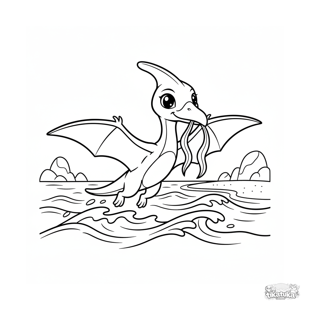 Ausmalbild für 7-9 Jahre: Ein Pterosaurier gleitet über einen uralten Ozean und trägt Seetang im Schnabel. Dynamische Szene im Paper-Cut-Stil.