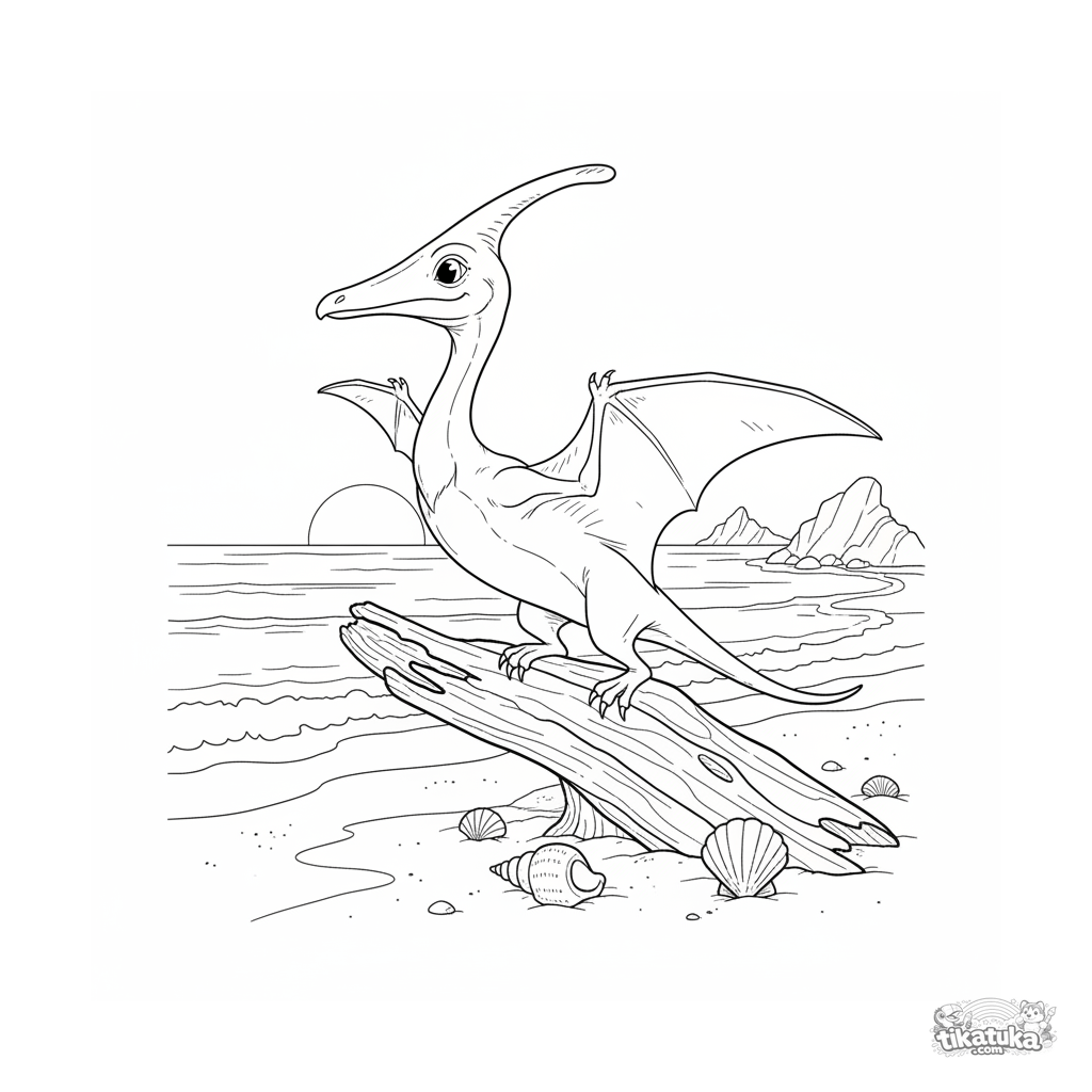 Ausmalbild für Tweens 7-9 Jahre: Ein Pterosaurier sitzt auf Treibholz an einem uralten sandigen Ozeanstrand und beobachtet das Wasser. Mäßiges Detail, natürliche Proportionen.