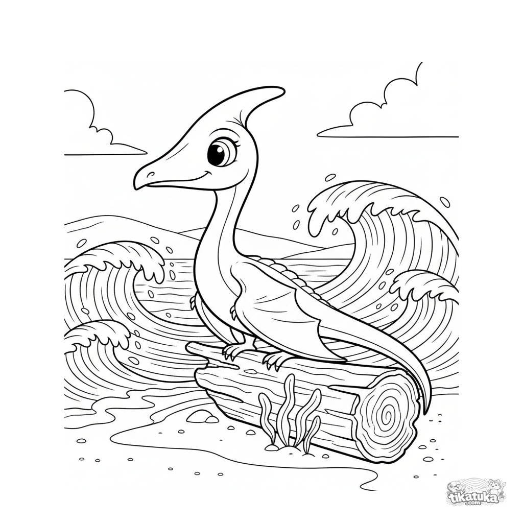 Ausmalbild für 7-9 Jahre: Ein Pterosaurier sitzt auf Treibholz und beobachtet die Wellen eines uralten Ozeans. Szene im Storybook-Stil mit Seetang.