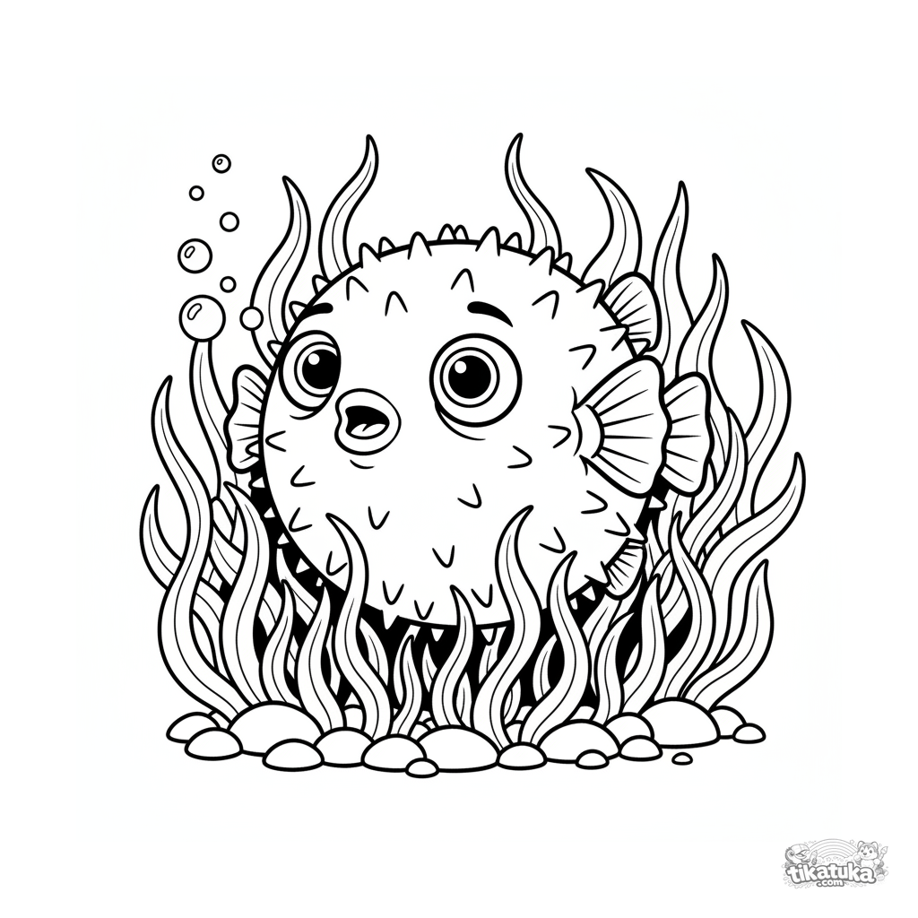 Ausmalbild eines überraschten Kugelfisches, der in einem sonnigen Seegrasbett aufgeblasen ist. Für 7-9 Jahre, ausdrucksstarke Emotionen.