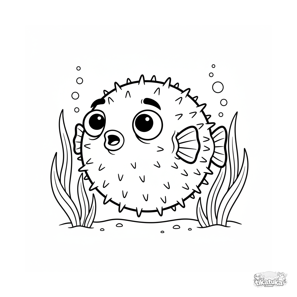 Ausmalbild für Kinder 7-9: Ein Kugelfisch bläht sich bei Seegras im flachen, sonnigen Wasser auf. Ausdrucksstarke Pose.