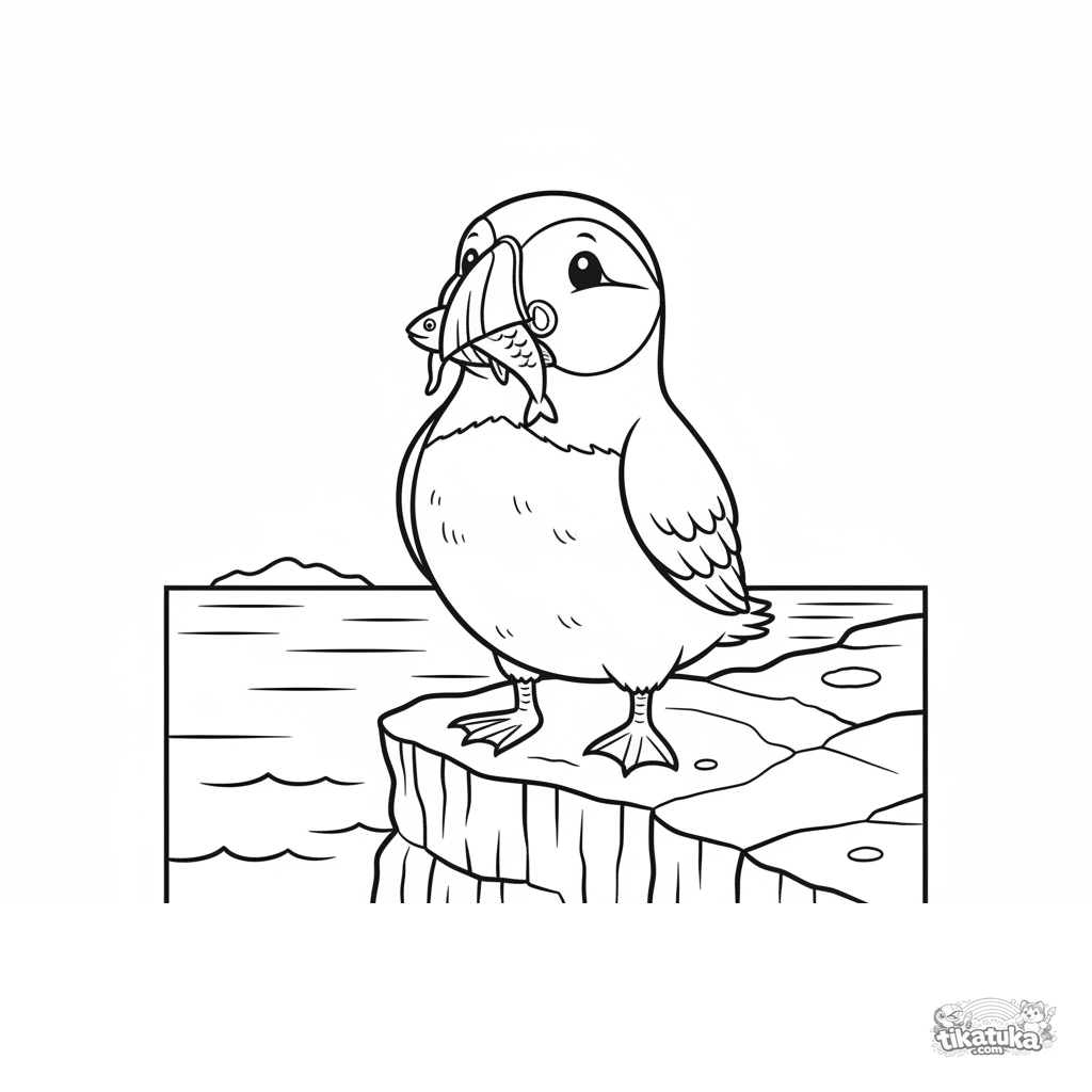 Ausmalbild für Kinder: ein Papageitaucher mit einem großen bunten Schnabel auf einer felsigen Meeresklippe. Mittlerer Schwierigkeitsgrad, Cartoon-Stil, für 4-6 Jahre.
