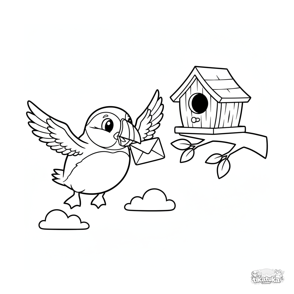 Ausmalbild für Kinder 4-6 im 80er-Cartoon-Stil: ein fröhlicher Papageitaucher fliegt zum Vogelhaus, um einen Brief zu liefern. Helle, dynamische Szene.