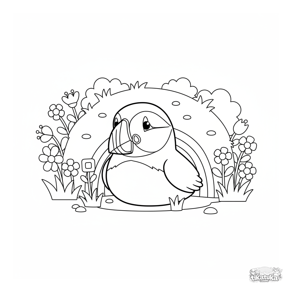 Ausmalbild für Kinder: Ein Papageientaucher lugt aus seiner Gras-Höhle auf einer Blumenwiese. Für Kinder von 4 bis 6 Jahren, niedliche Szene.