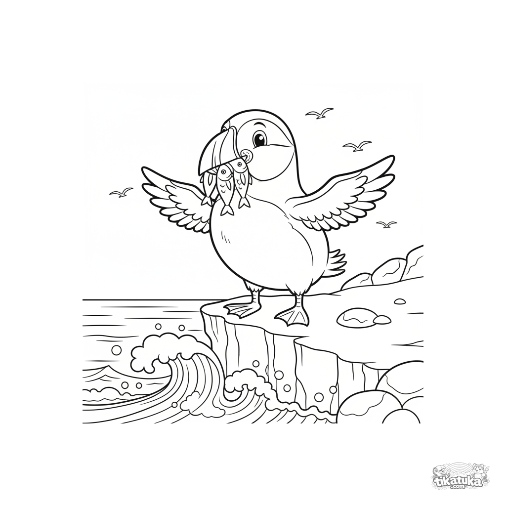 Ausmalbild eines Papageitauchers, der auf einer Felsenklippe steht und Fische im Schnabel hält. Für Kinder von 4-6 Jahren. Im Hintergrund sind Meereswellen und Möwen zu sehen.