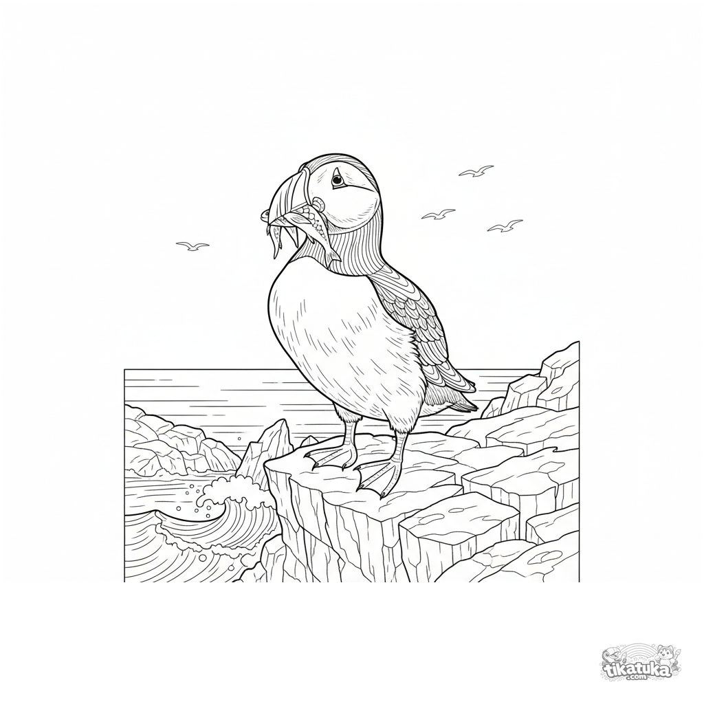 Detailliertes Ausmalbild eines Papageitauchers auf einer felsigen Klippe für Kinder von 7-12 Jahren. Der Vogel hält einen Fisch im Schnabel vor dem Hintergrund von Meereswellen.