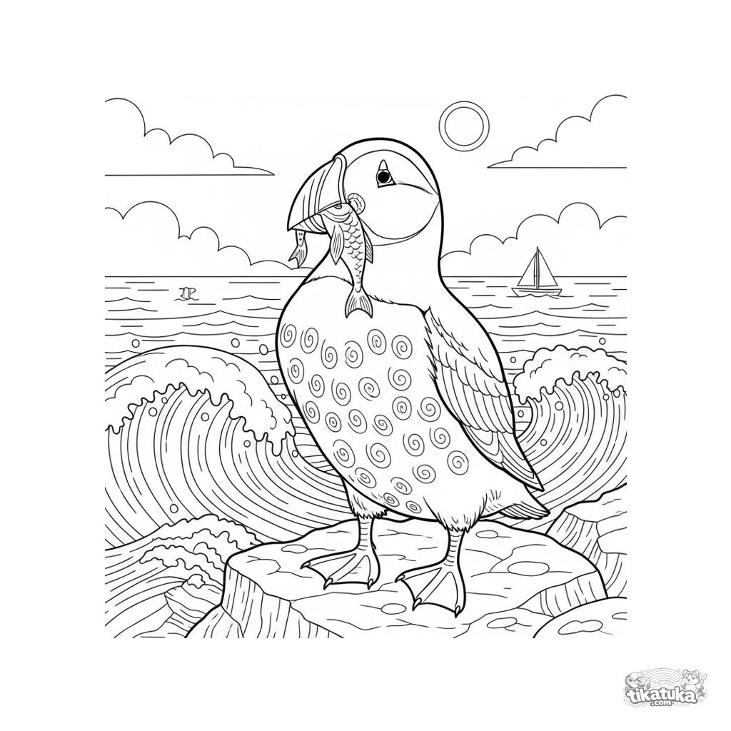 Detailliertes Papageitaucher-Ausmalbild für Kinder von 7-12 Jahren. Zeigt den Vogel auf einer felsigen Klippe, der einen Fisch im Schnabel hält, mit Ozean und Wellen im Hintergrund.