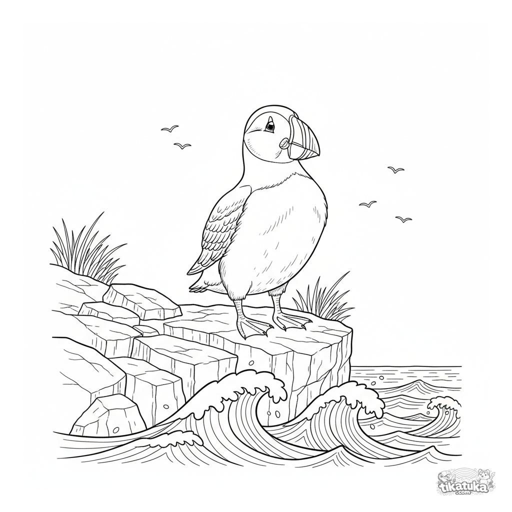 Schwieriges Ausmalbild für Kinder 7-12: ein Papageitaucher auf einer felsigen Klippe. Hohes Detail und Texturen für geübte Maler.