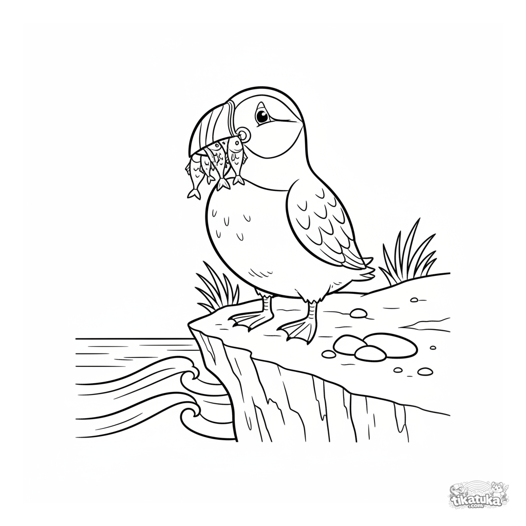 Detailliertes Ausmalbild für Kinder von 7-12 Jahren: Ein Papageitaucher mit schnabelfüllendem Fisch steht auf einer felsigen Klippe über dem Ozean. Viele Texturen und interessante Elemente.