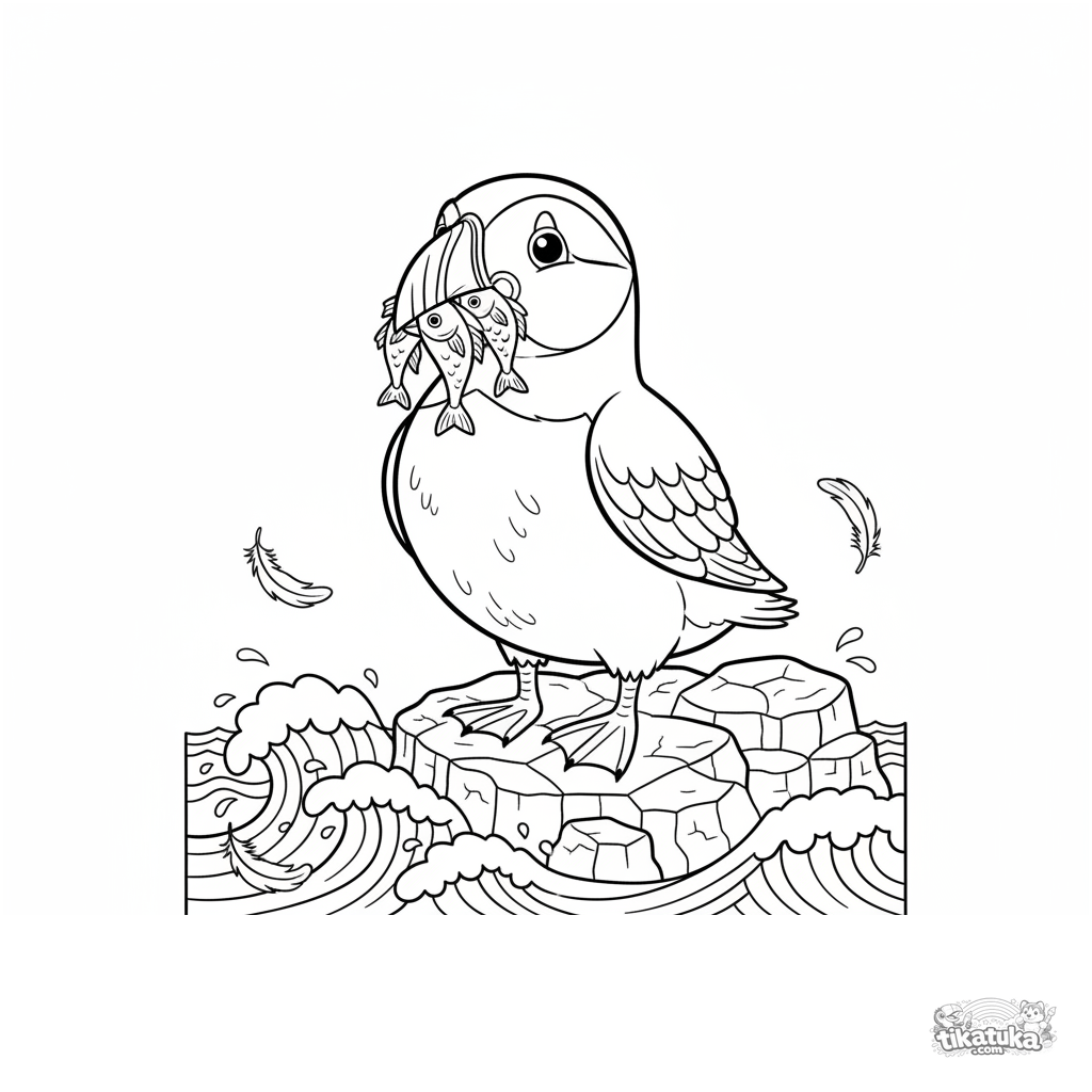 Ausmalbild eines Papageitauchers für Kinder von 7-12 Jahren. Der Papageitaucher steht auf einer Klippe mit einem Schnabel voller glänzender Fische, vor Ozeanwellen.