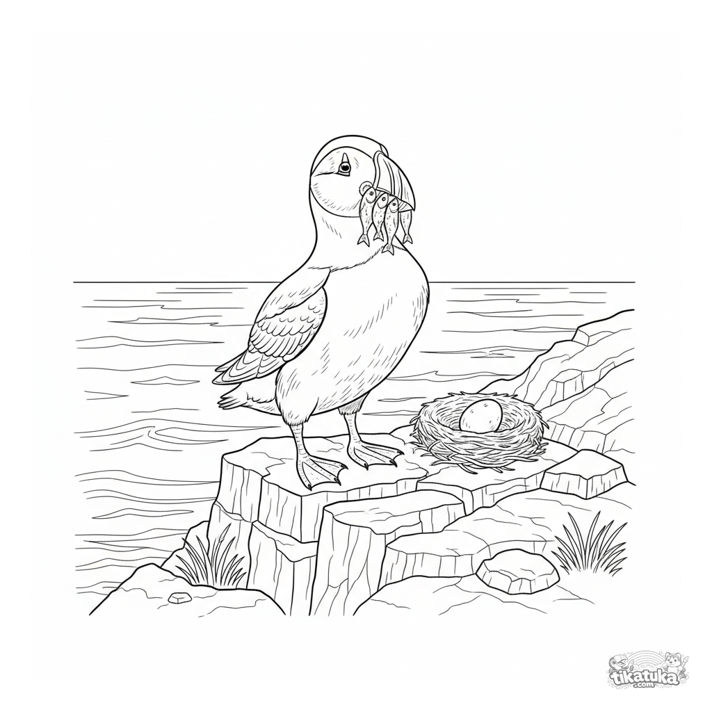 Detailliertes Ausmalbild für Kinder von 7-12 Jahren mit einem Papageitaucher. Der Papageitaucher steht auf einer Felsklippe mit Fisch im Schnabel, mit Blick auf den Ozean und ein Nest.