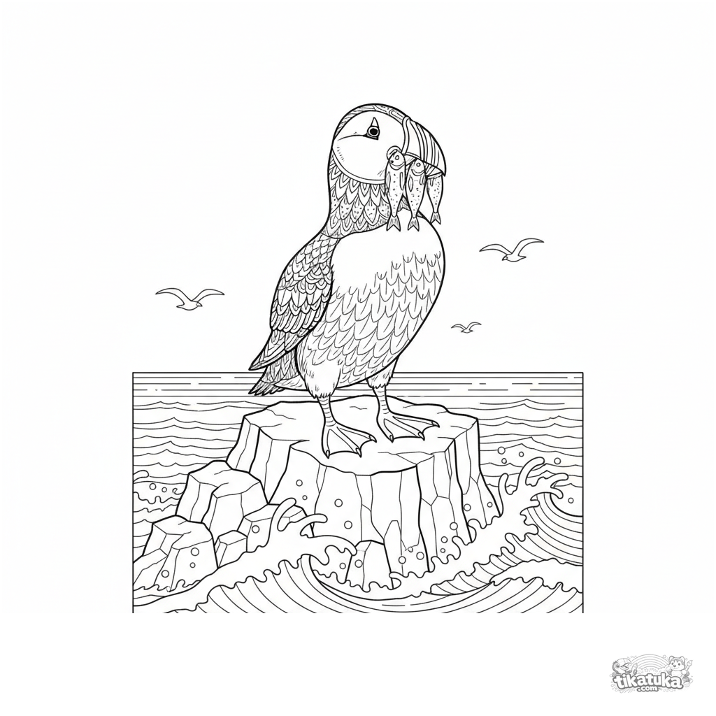 Detailliertes Ausmalbild für Kinder von 7-12 Jahren mit einem Papageitaucher. Der Papageitaucher steht auf einer felsigen Klippe über dem Meer und hält mehrere kleine Fische im Schnabel.